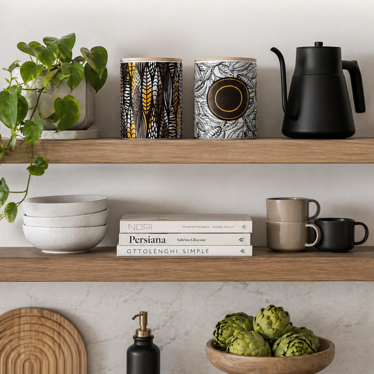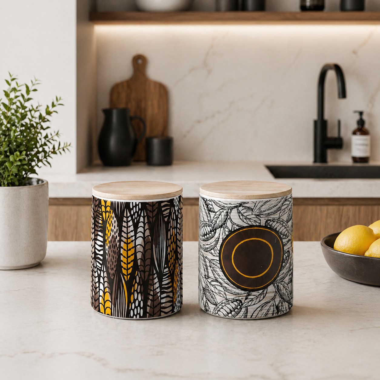 Ανανεώστε την οργάνωση της κουζίνας σας με αυτό το κομψό σετ 2 κεραμικών δοχείων αποθήκευσης, που συνδυάζει μοντέρνο σχεδιασμό και πρακτική λειτουργικότητα. Ιδανικά για καθημερινή χρήση αλλά και ως διακοσμητικά στοιχεία πάγκου ή ραφιού κουζίνας.