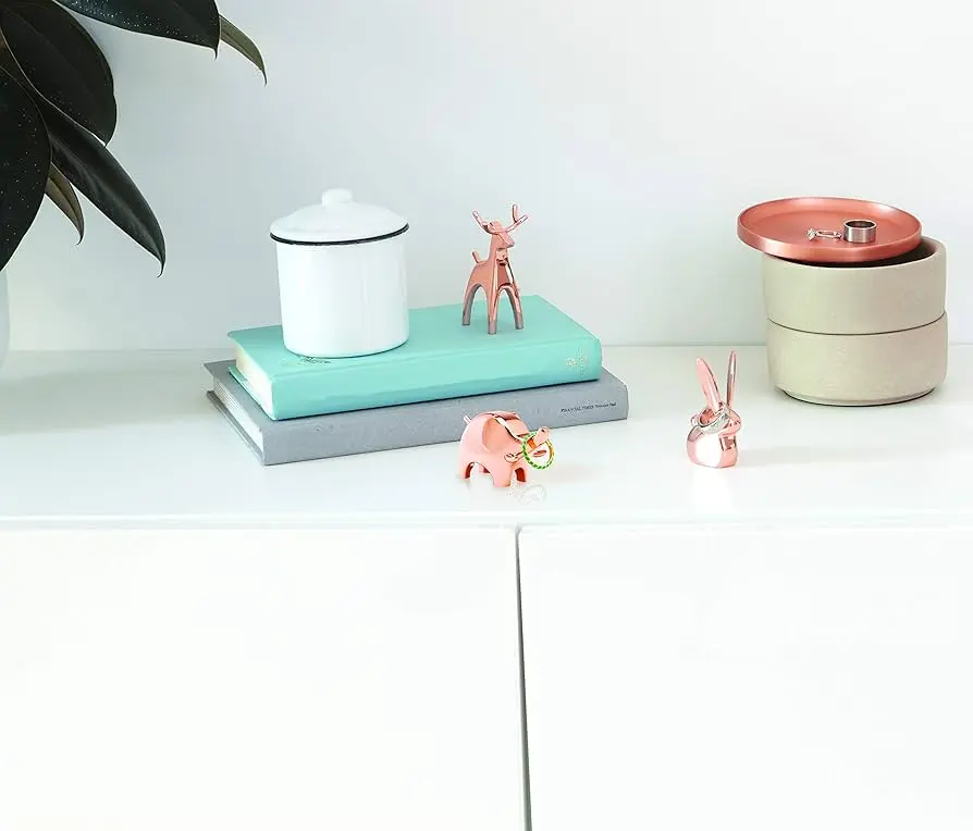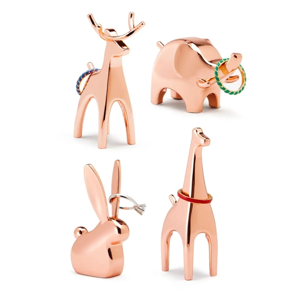 Τα τέσσερα αυτά διακοσμητικά animal ring holders αποτελούν μια κομψή και πρακτική πρόταση για την οργάνωση κοσμημάτων, συνδυάζοντας minimal αισθητική με playful χαρακτήρα. Με σύγχρονη μεταλλική εμφάνιση στο χρώμα του γυαλισμένου χαλκού, λειτουργούν ταυτόχρονα ως χρηστικά αντικείμενα και ως ιδιαίτερα διακοσμητικά στοιχεία για κάθε χώρο του σπιτιού.
