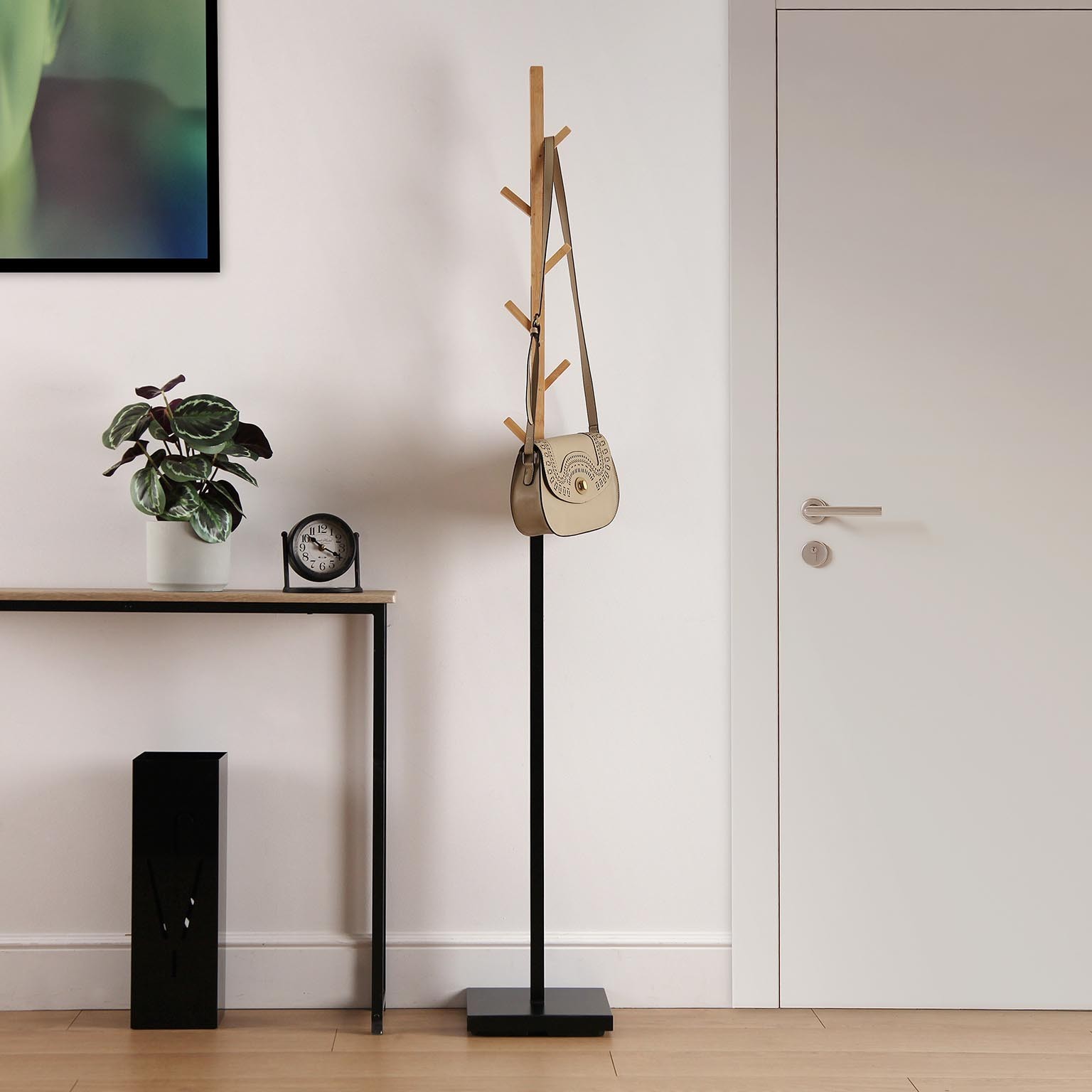 Αναβαθμίστε την οργάνωση και τη διακόσμηση του χώρου σας με έναν κομψό καλόγερο ρούχων σε μοντέρνο σκανδιναβικό design. Με συνδυασμό μεταλλικής βάσης και φυσικού ξύλου bamboo στο επάνω μέρος και στους γάντζους, αποτελεί μια πρακτική και αισθητικά ισορροπημένη λύση για την καθημερινή αποθήκευση ρούχων και αξεσουάρ.Διαθέτει 6 ανοιγόμενους γάντζους κρεμάσματος από ξύλο μπαμπού.